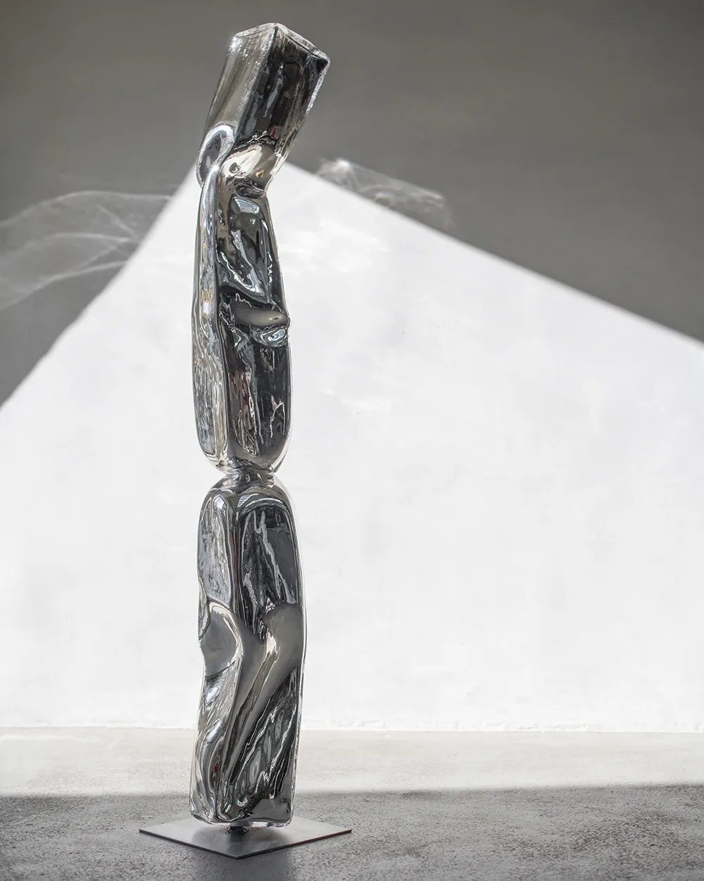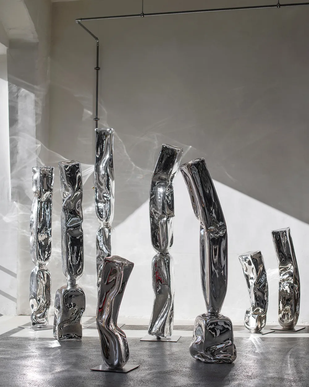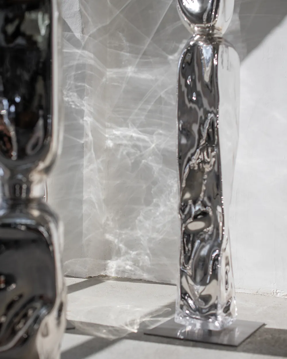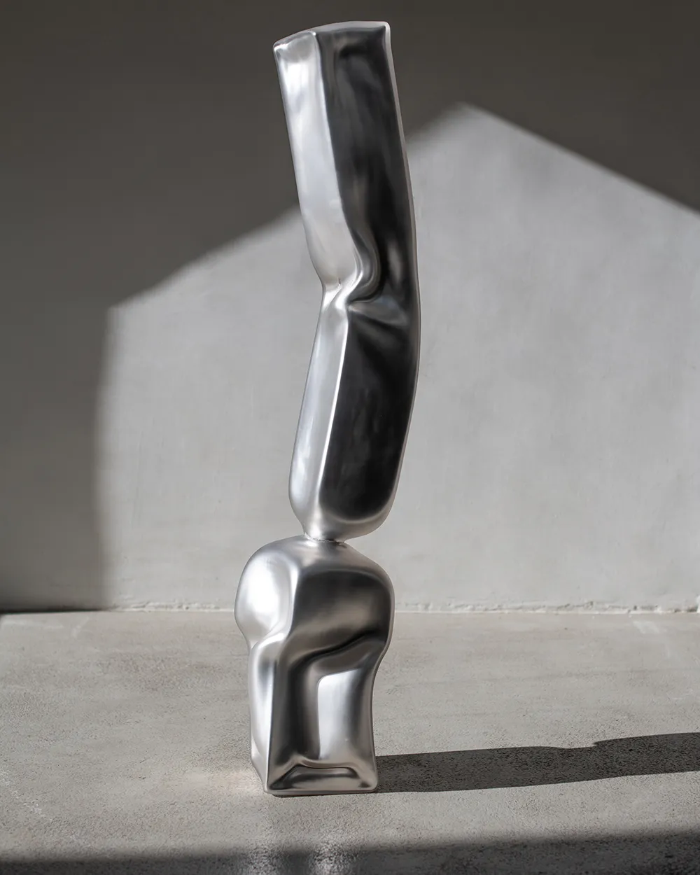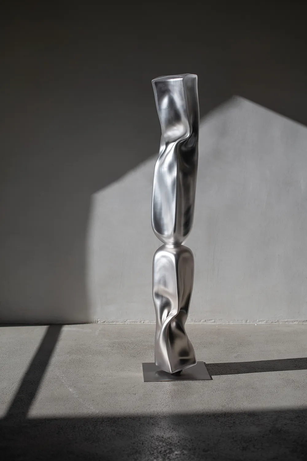 Diese Skulpturen wirken wie fließende, metallische Kuben, die in Bewegung erstarrt sind, fast so, als ob das Material weich und dehnbar wäre. Ihre abstrakten Formen spielen mit Licht und Schatten, was ihre dynamische Gestalt betont. Die reflektierende Oberfläche strahlt Eleganz aus und ERFORSCHT DIE SCHÖNHEIT VON IMPERFEKTION.