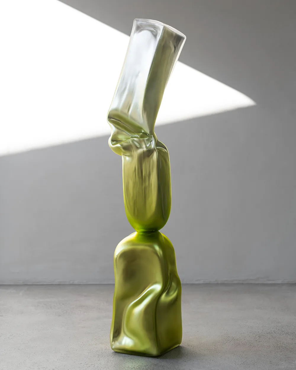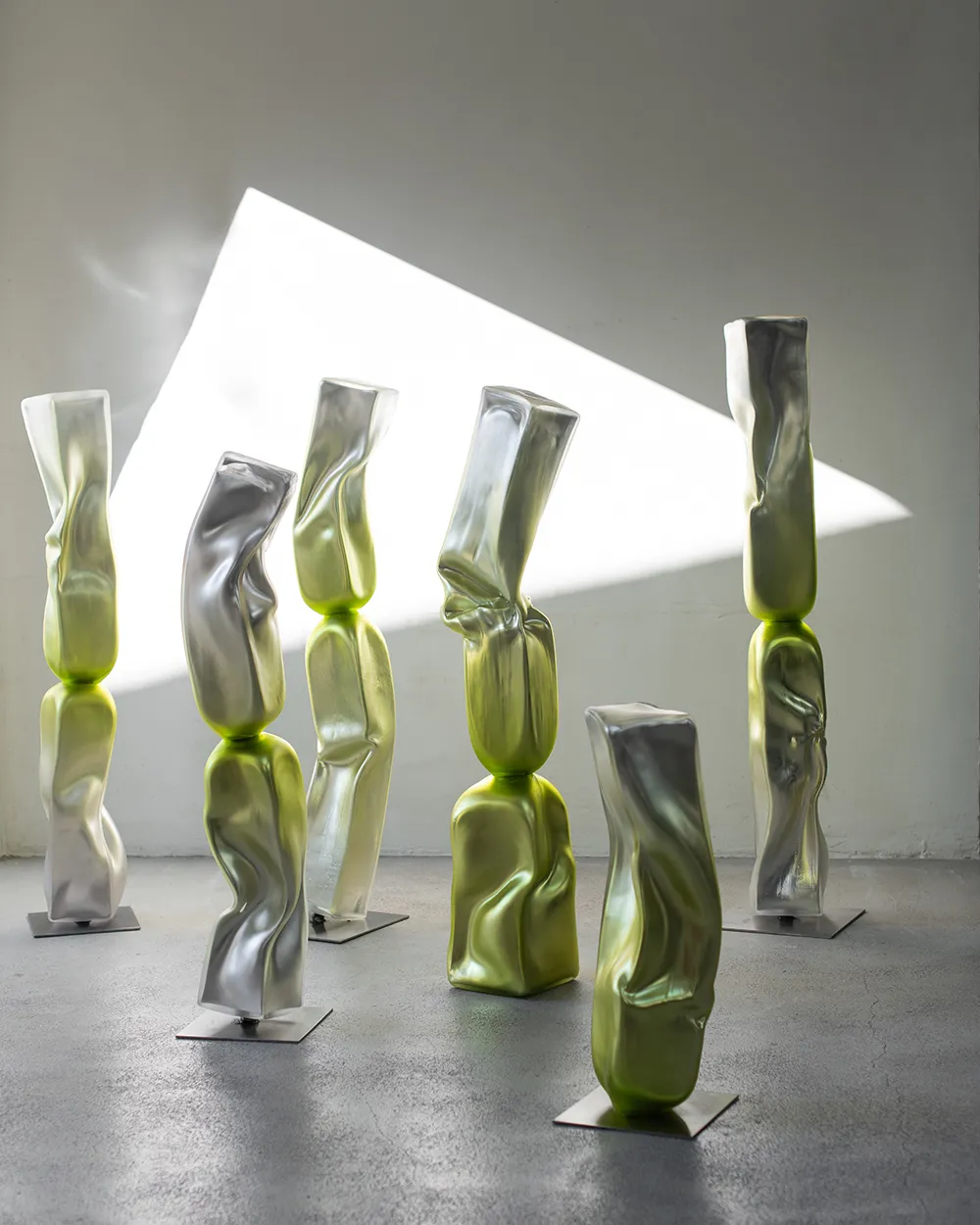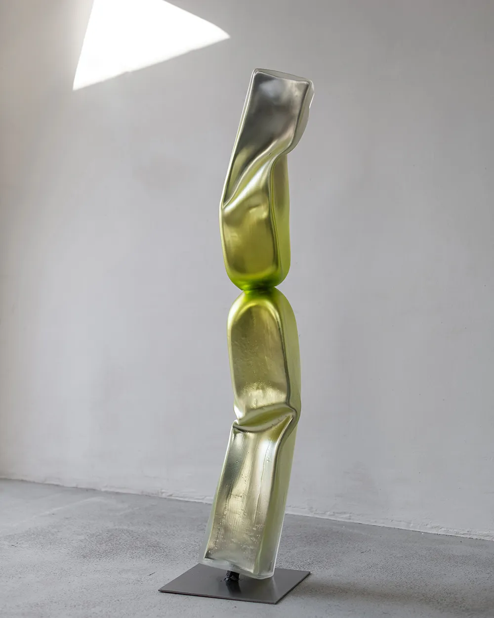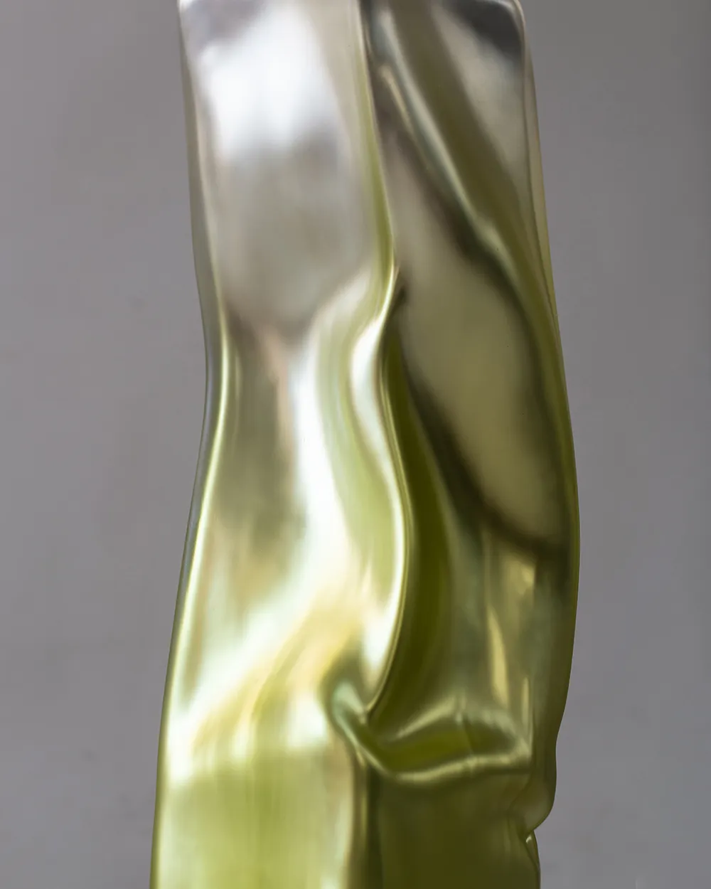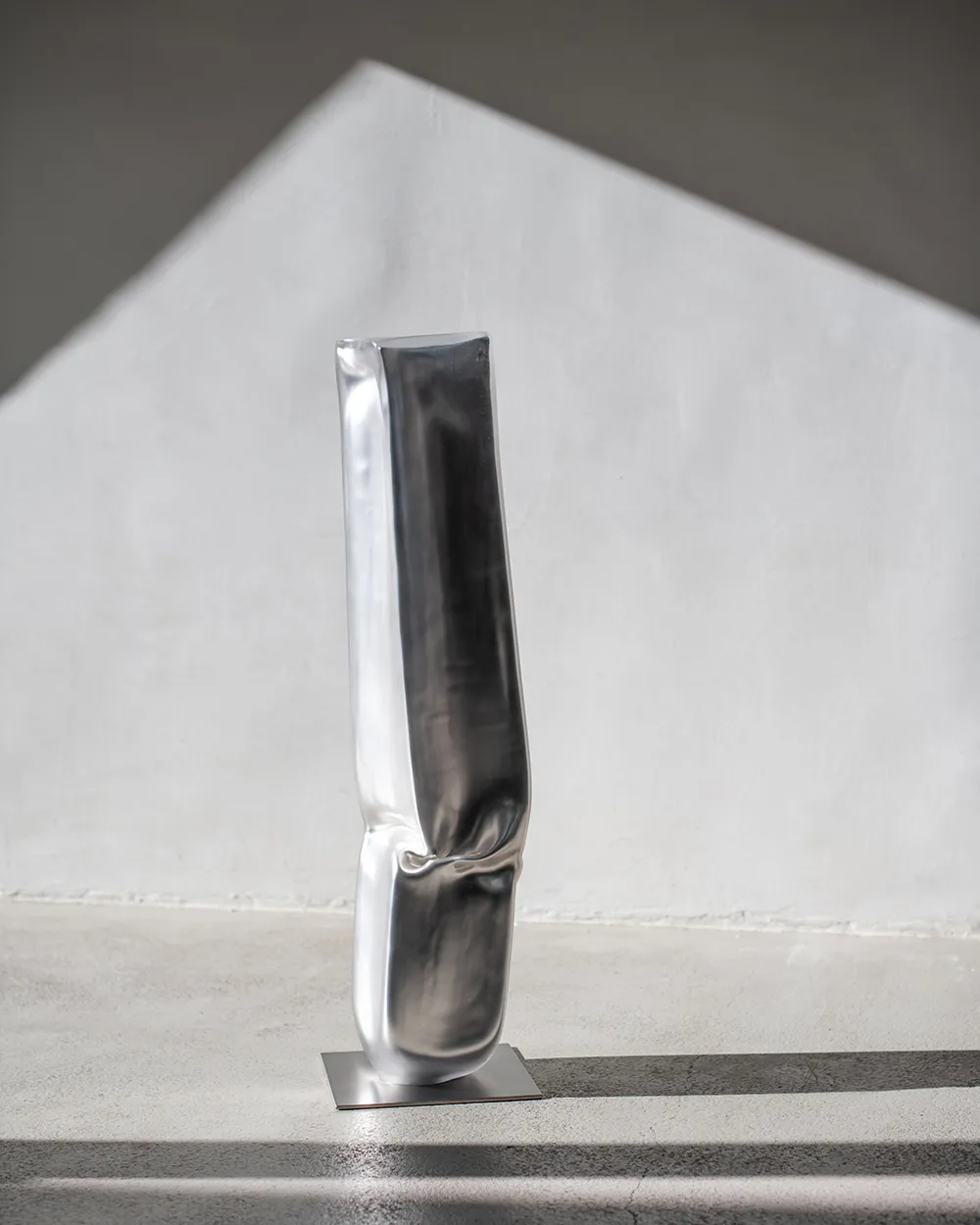 Diese Skulpturen wirken wie fließende, metallische Kuben, die in Bewegung erstarrt sind, fast so, als ob das Material weich und dehnbar wäre. Ihre abstrakten Formen spielen mit Licht und Schatten, was ihre dynamische Gestalt betont. Die reflektierende Oberfläche strahlt Eleganz aus und ERFORSCHT DIE SCHÖNHEIT VON IMPERFEKTION.