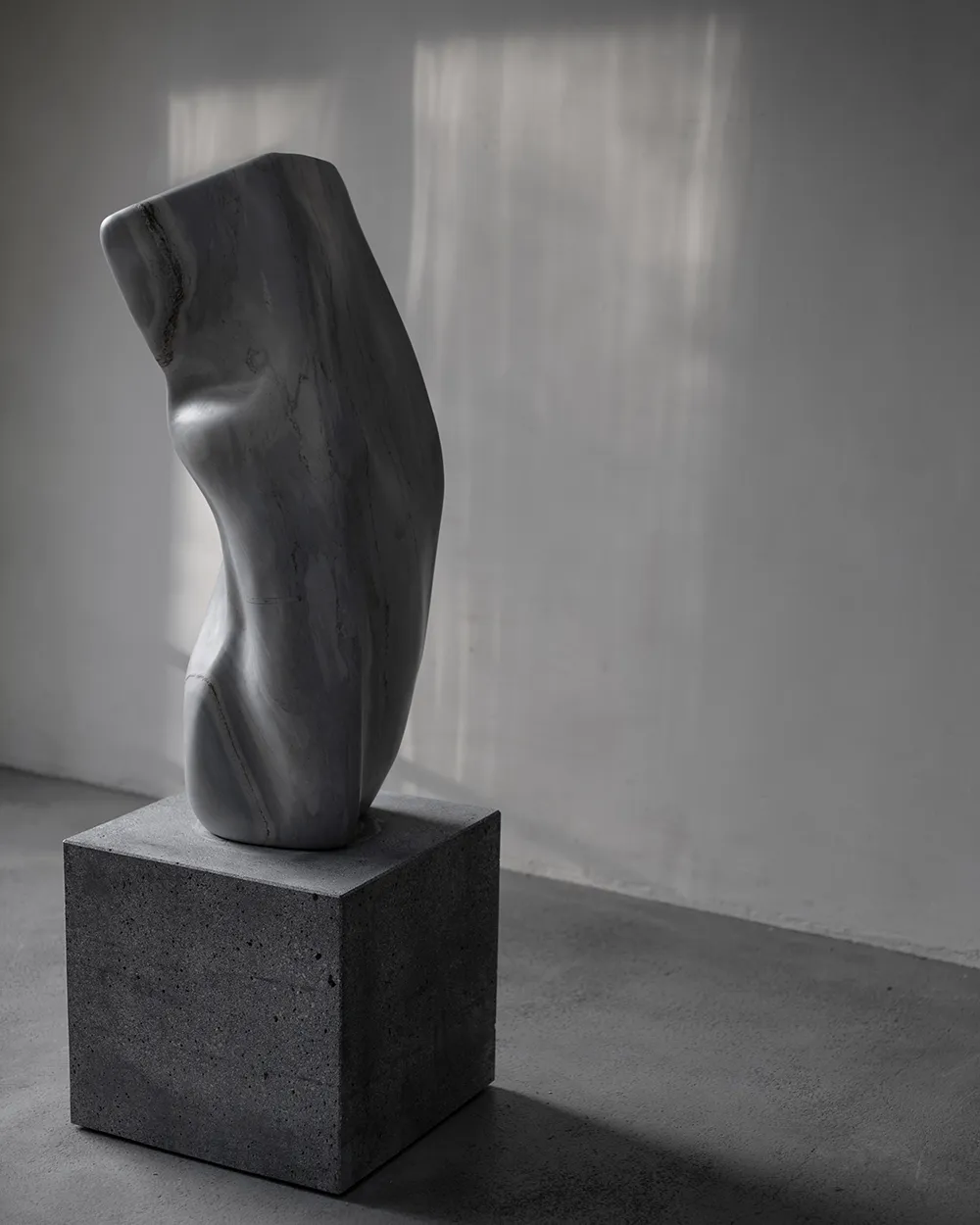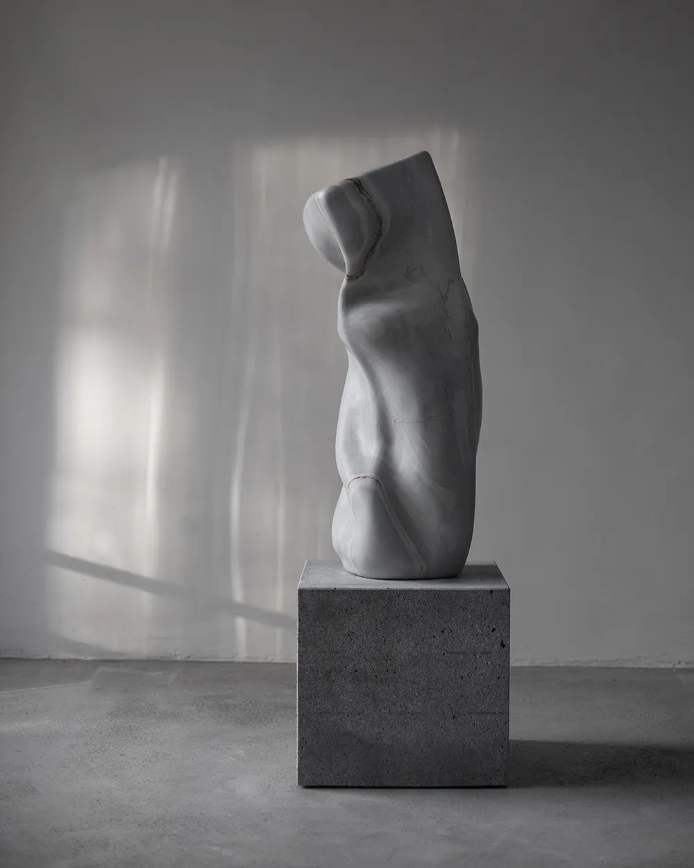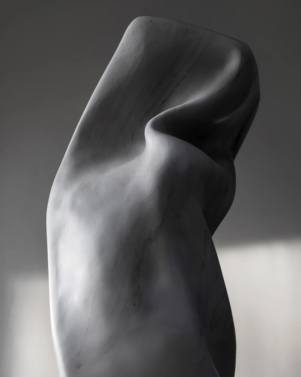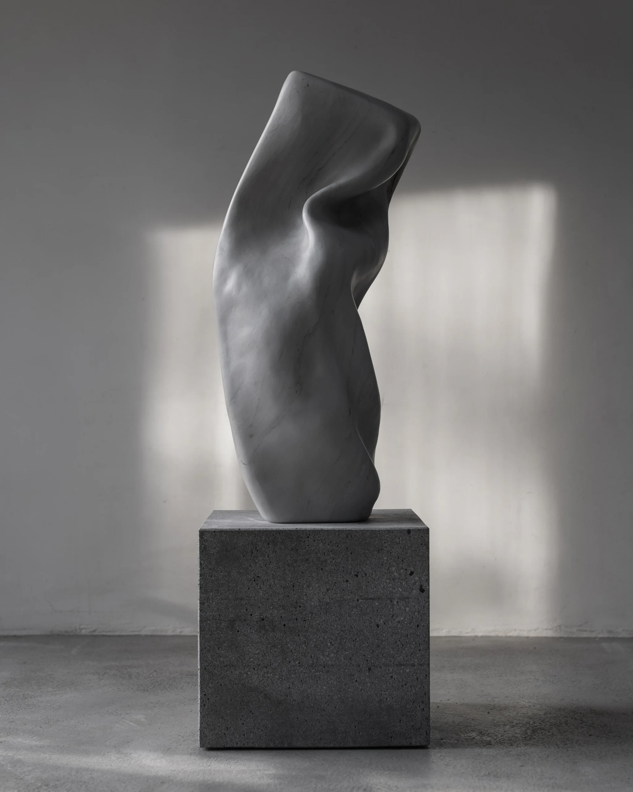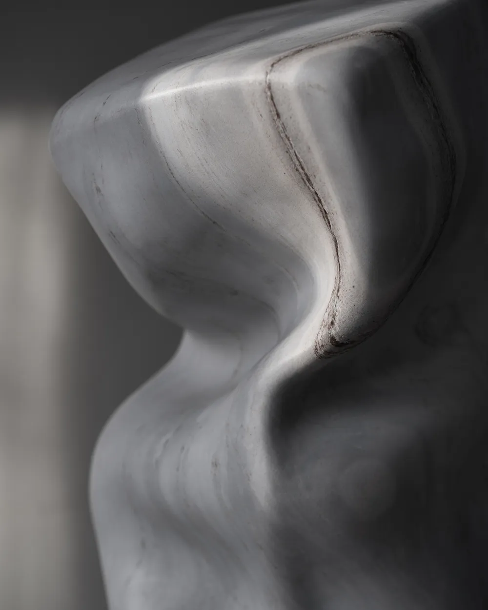 Diese Skulptur spiegelt die organischen Bewegungen des Glases in den weichen Zeichnungen des Marmors wider. Das Glas, mit seiner zerbrechlichen Schönheit, und der Marmor, mit seiner lebendigen Haptik, vereinen sich in einem harmonischen Dialog.