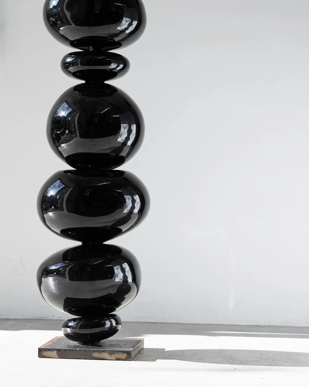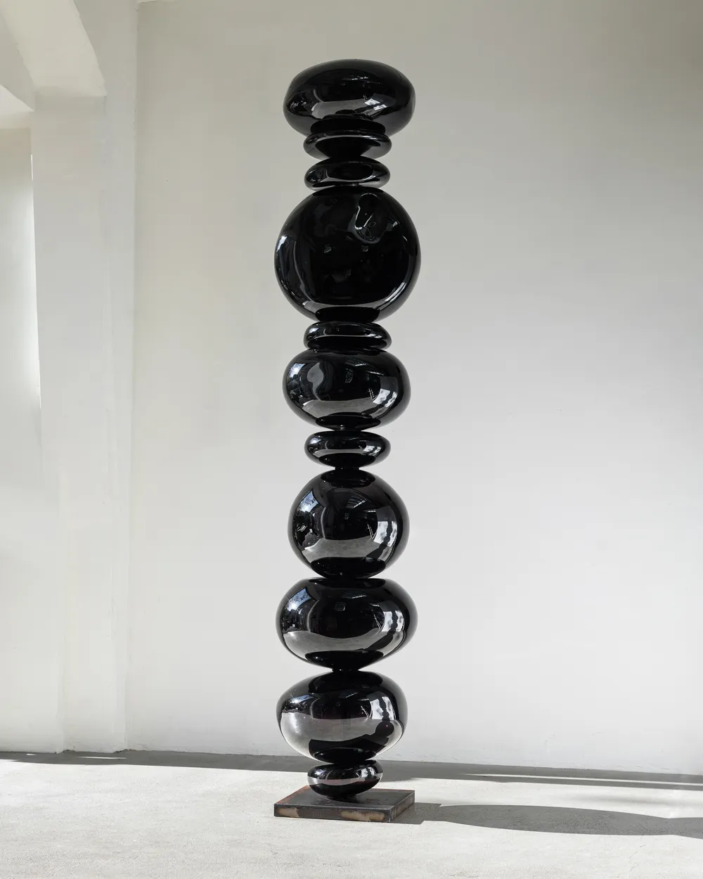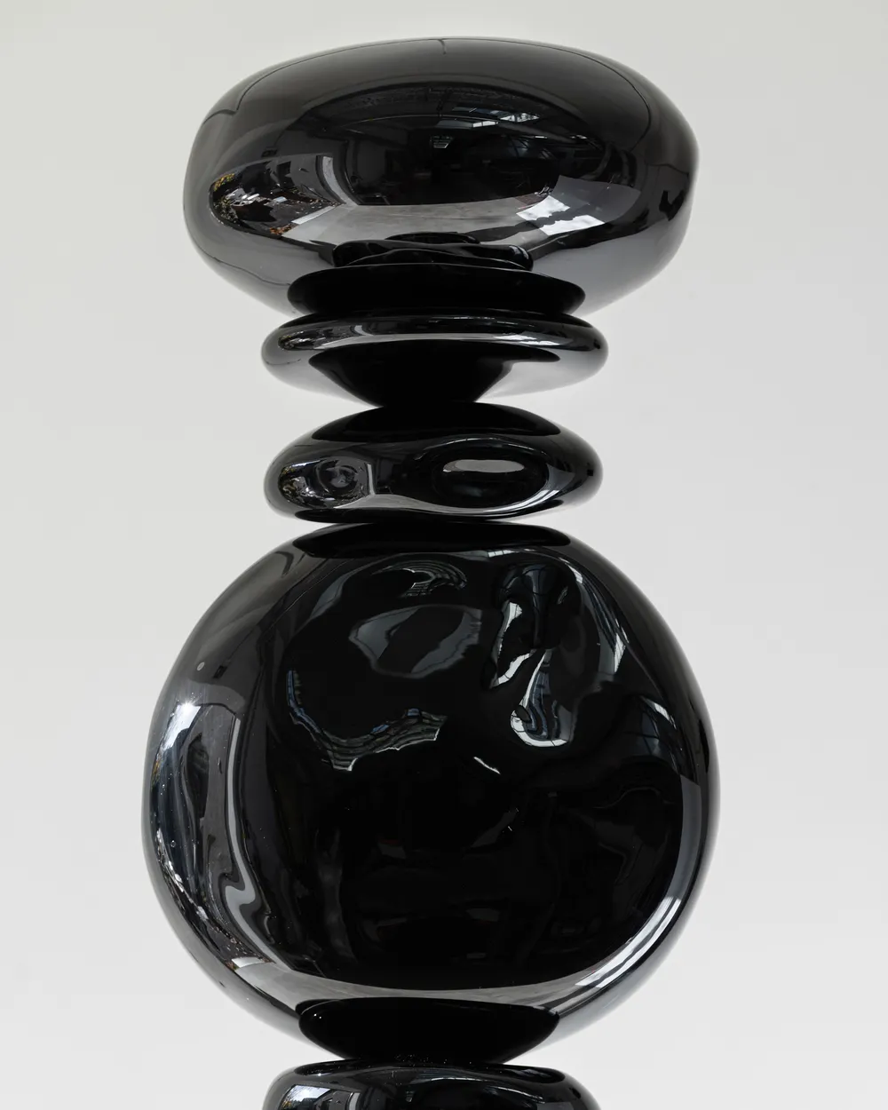 Dieses Werk besteht aus elf übereinander positionierten Ellipsoiden, in unterschiedlichen Ausmaßen vertikal gestaucht – manche davon so stark, dass sie an flache Linsen erinnern. Dabei sticht jenes Element heraus, welches um 90 Grad gedreht angeordnet ist und somit dessen flache Seite in Richtung der Betrachter zeigt. Diese spiegeln sich im pechschwarzen, undurchsichtigen Glas.