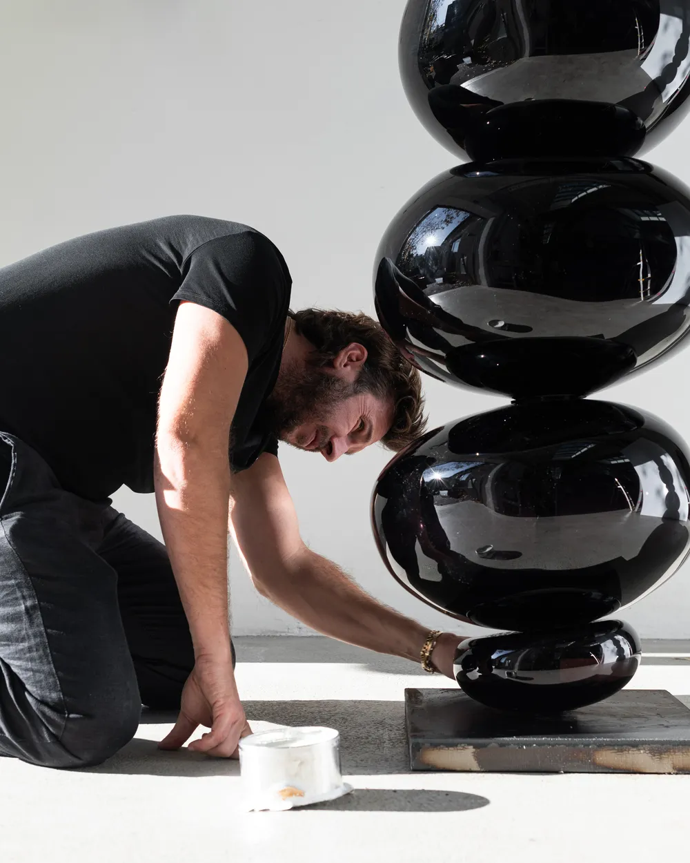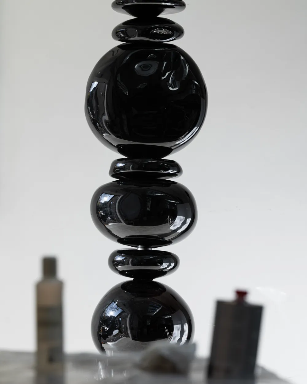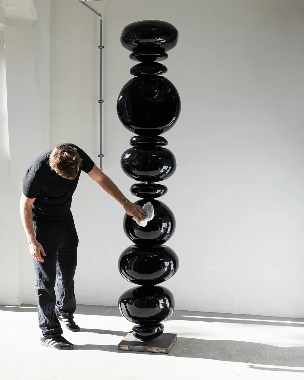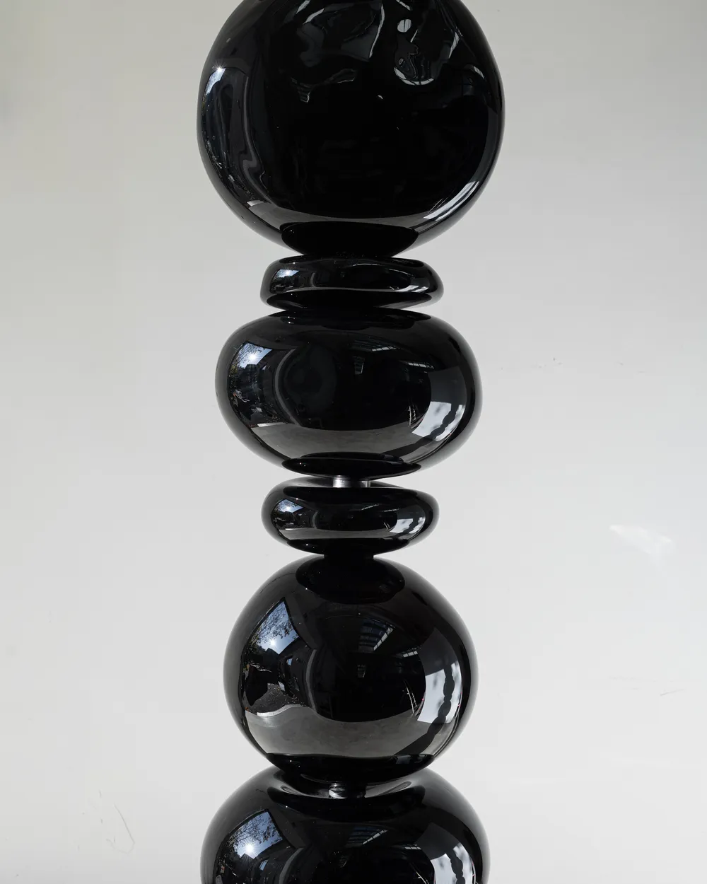 Dieses Werk besteht aus elf übereinander positionierten Ellipsoiden, in unterschiedlichen Ausmaßen vertikal gestaucht – manche davon so stark, dass sie an flache Linsen erinnern. Dabei sticht jenes Element heraus, welches um 90 Grad gedreht angeordnet ist und somit dessen flache Seite in Richtung der Betrachter zeigt. Diese spiegeln sich im pechschwarzen, undurchsichtigen Glas.
